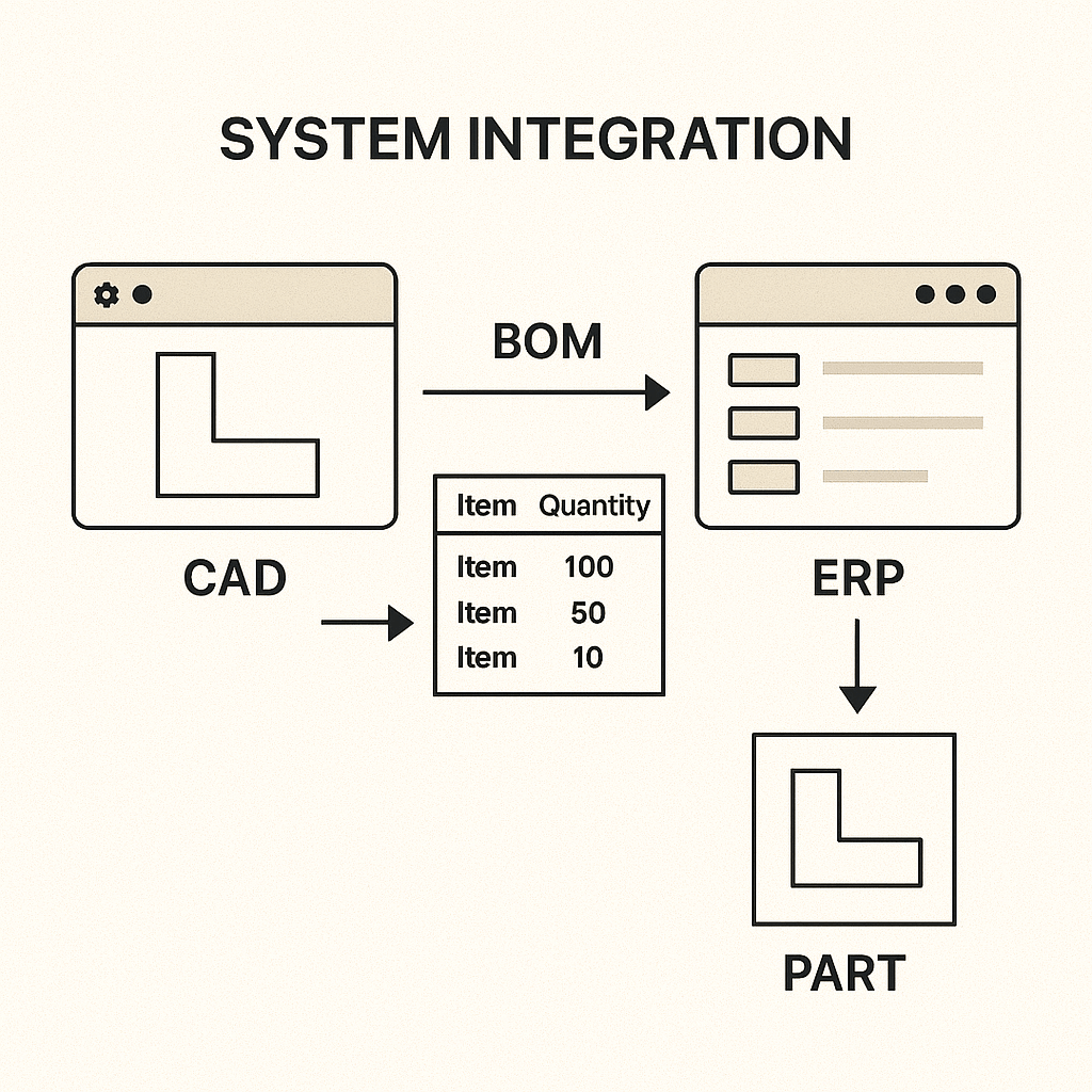 One of our standout projects achieved full integration between SolidWorks and our ERP platform, enabling real-time synchronization of bills of material (BOMs), routings, part drawings, and technical attributes — directly from CAD to ERP.